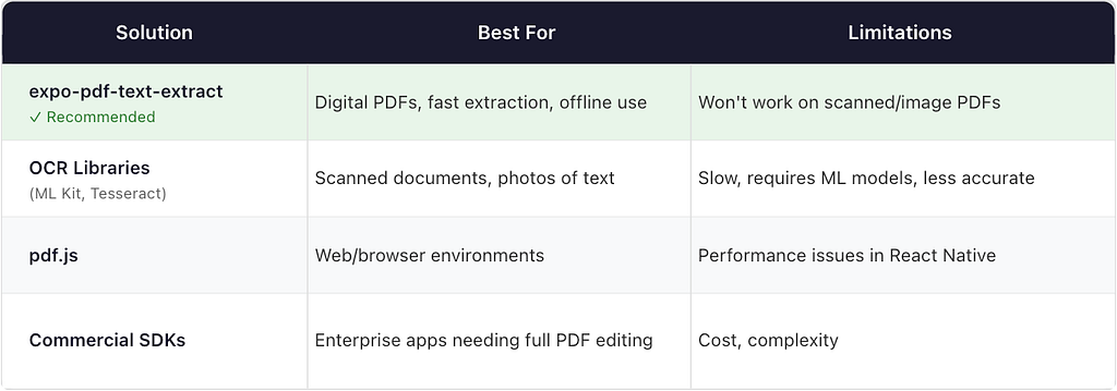 PDF Viewer Libraries — Great for displaying PDFs, useless for getting the text out. WebView-based solutions can’t expose the underlying content to your JavaScript code.
